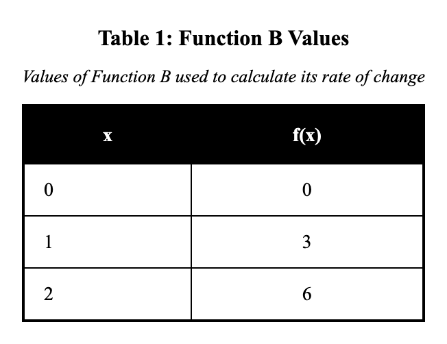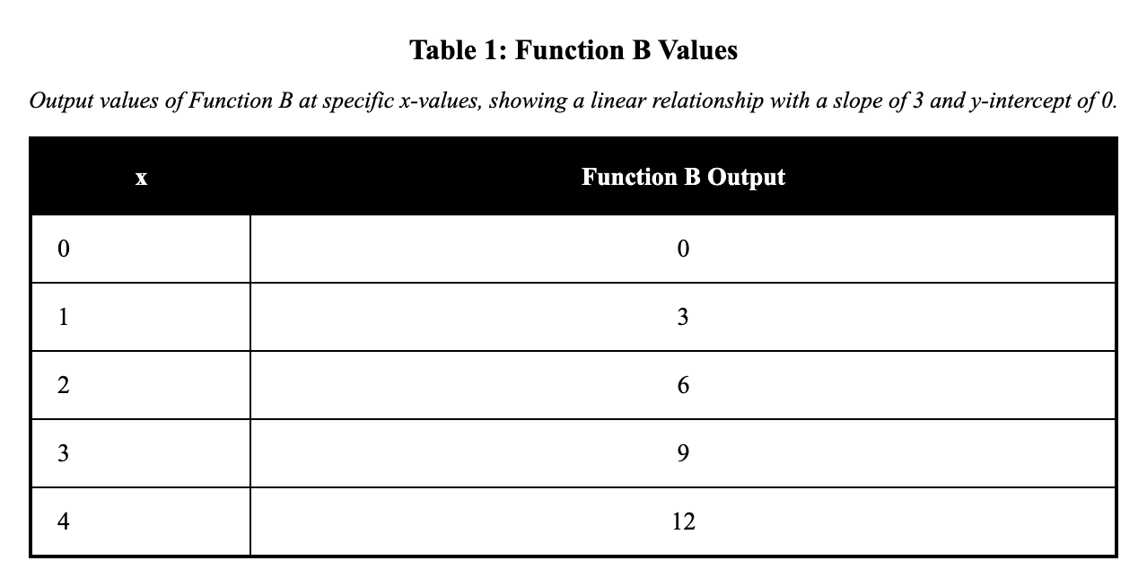 Function B is described as: “Starts at 4 and increases by 2 each time $x$ increases by 1.”