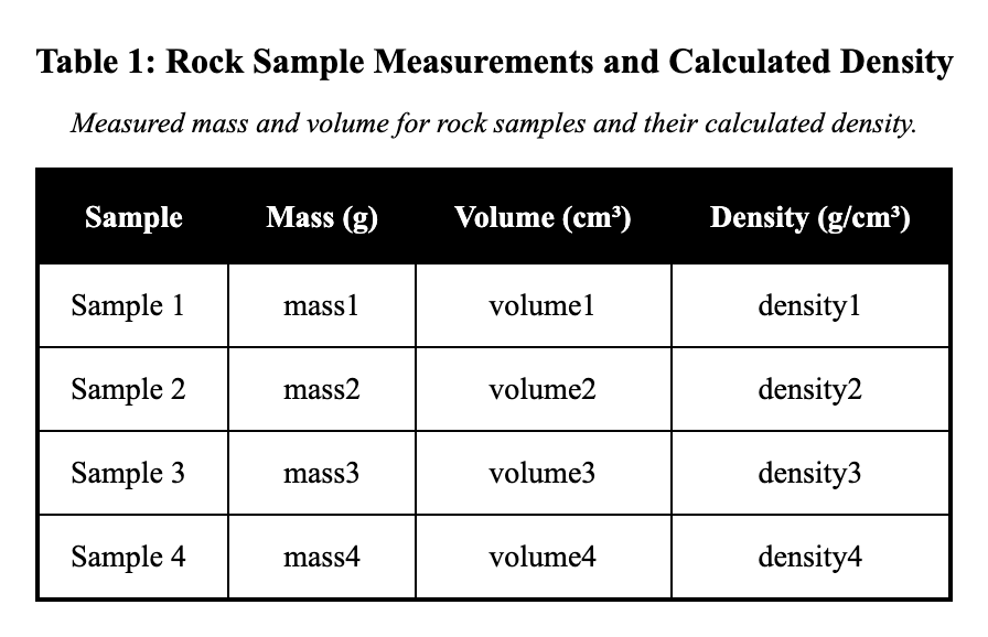 Table B computes density from the raw mass and volume measurements provided in Table A for the same rock samples. Table A lists measured mass in grams (g) from a balance and volume in cm³ from water displacement for four samples; Table B lists density in g/cm³ calculated as mass divided by volume. This derivation matters because density summarizes a material property independent of sample size, facilitating comparisons that raw measurements alone do not. A distractor might reverse the measured and calculated roles, but the captions specify A as primary data and B as computed.