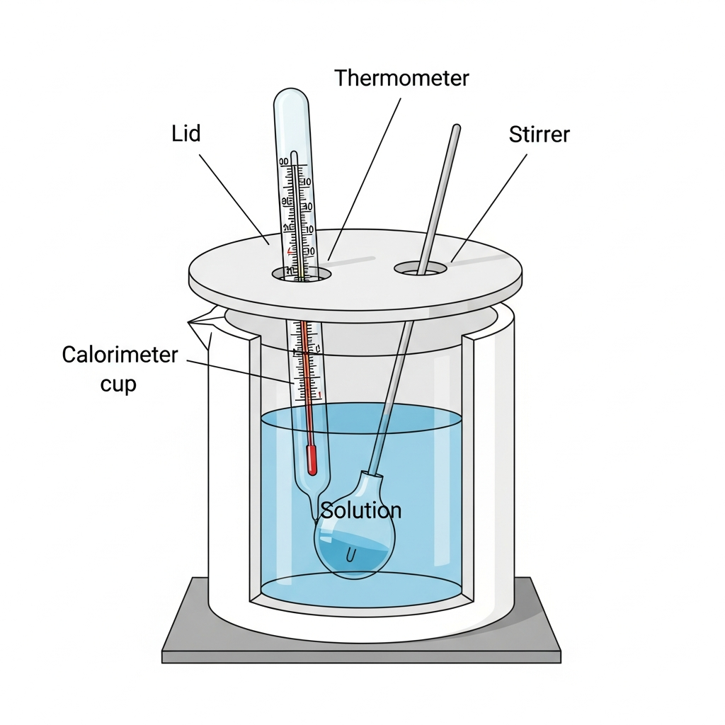 The calorimeter diagram shows a cross-sectional view with the lid on top and various components passing through it. The thermometer probe is clearly shown as a long, thin instrument that passes through a hole in the lid and extends down into the solution inside the calorimeter cup. This positioning allows it to measure the temperature of the solution directly. The stirrer rod also passes through the lid but serves a different function of mixing the solution.