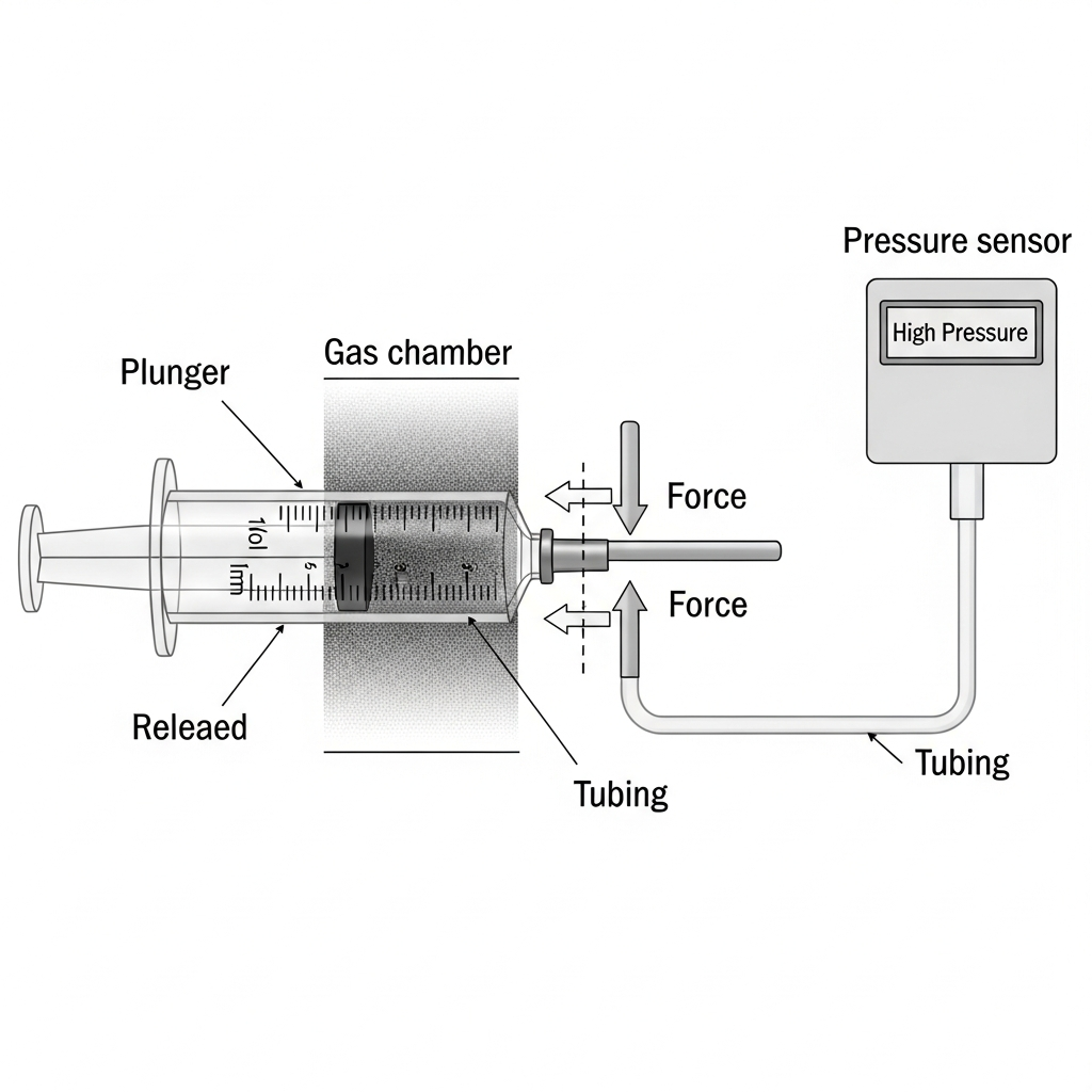 A mechanical engineering student studies a labeled diagram of a syringe connected to a pressure sensor (Figure 1). Arrows indicate the direction of force applied to the plunger. According to Figure 1, increasing pressure in the gas chamber would be most directly caused by moving the plunger: