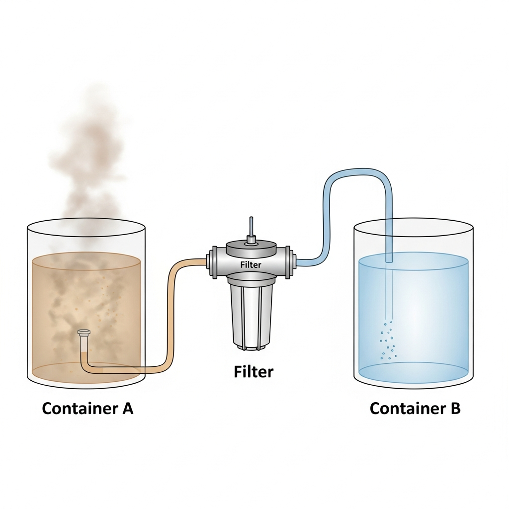 A student investigates how water flows through a filtration apparatus. Figure 1 shows the setup, including tubing connections and the direction of flow (arrows). The student wants to collect the filtered water that exits the filter. According to Figure 1, which container should receive the filtered water?