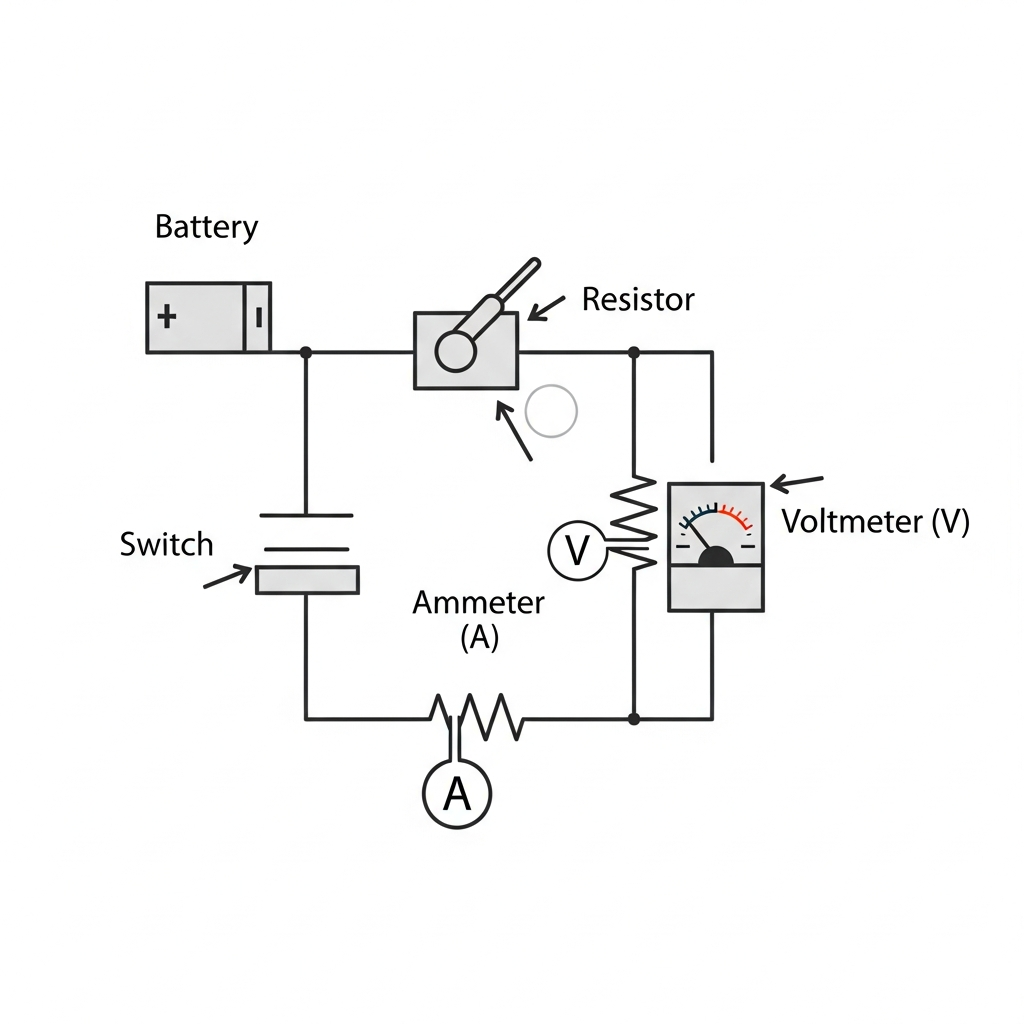 The circuit diagram shows a resistor connected in the main circuit path with an ammeter in series and a voltmeter connected across the resistor. The voltmeter is drawn with connection lines that branch off from both sides of the resistor, creating a parallel path that doesn't interrupt the main current flow. This parallel connection allows the voltmeter to measure the potential difference across the resistor. The ammeter is in series with the resistor, not parallel, as current must flow through it.