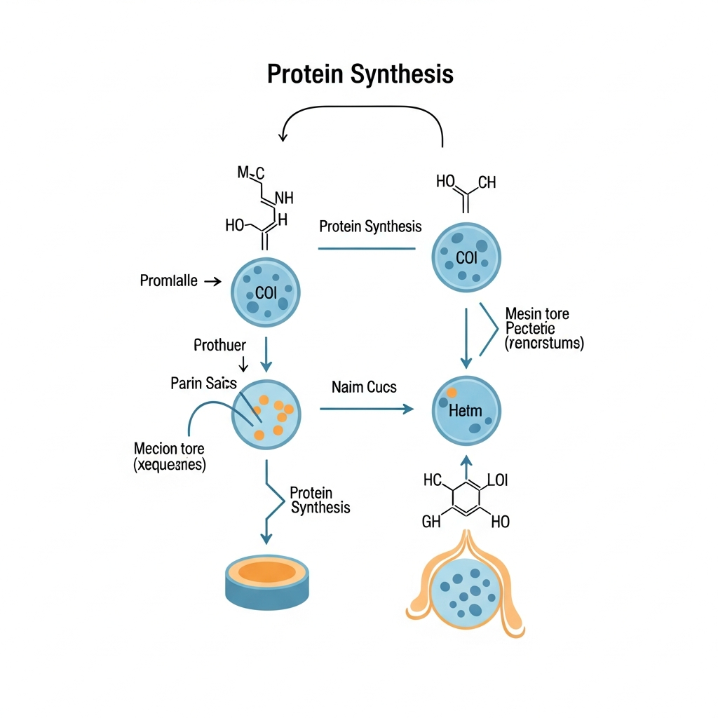 The protein synthesis diagram shows mRNA moving from the nucleus through a nuclear pore into the cytoplasm, with an arrow indicating its path. The next arrow in the sequence shows the mRNA binding to a ribosome structure in the cytoplasm, which is the immediate next step after nuclear exit. This binding initiates translation where the genetic code is read to produce proteins. The diagram clearly shows this sequential flow from nuclear exit to ribosome binding without intervening steps.