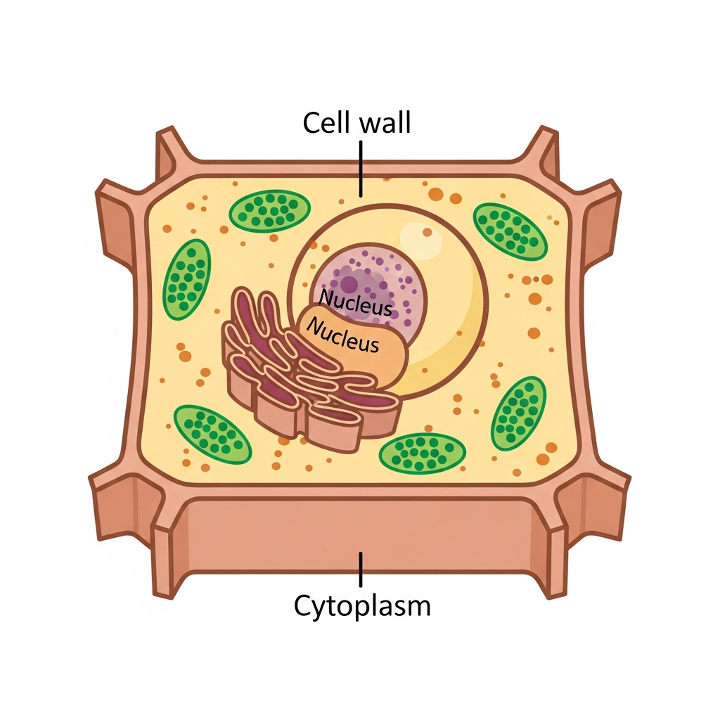 The plant cell diagram shows a large central vacuole occupying most of the cell's interior, with the nucleus near the center and chloroplasts distributed in the cytoplasm. The chloroplasts are clearly drawn as small oval structures positioned in the cytoplasm between the cell membrane and the central vacuole, not inside any other organelle. This peripheral location in the cytoplasm allows chloroplasts to capture light efficiently while remaining outside the vacuole's aqueous interior.