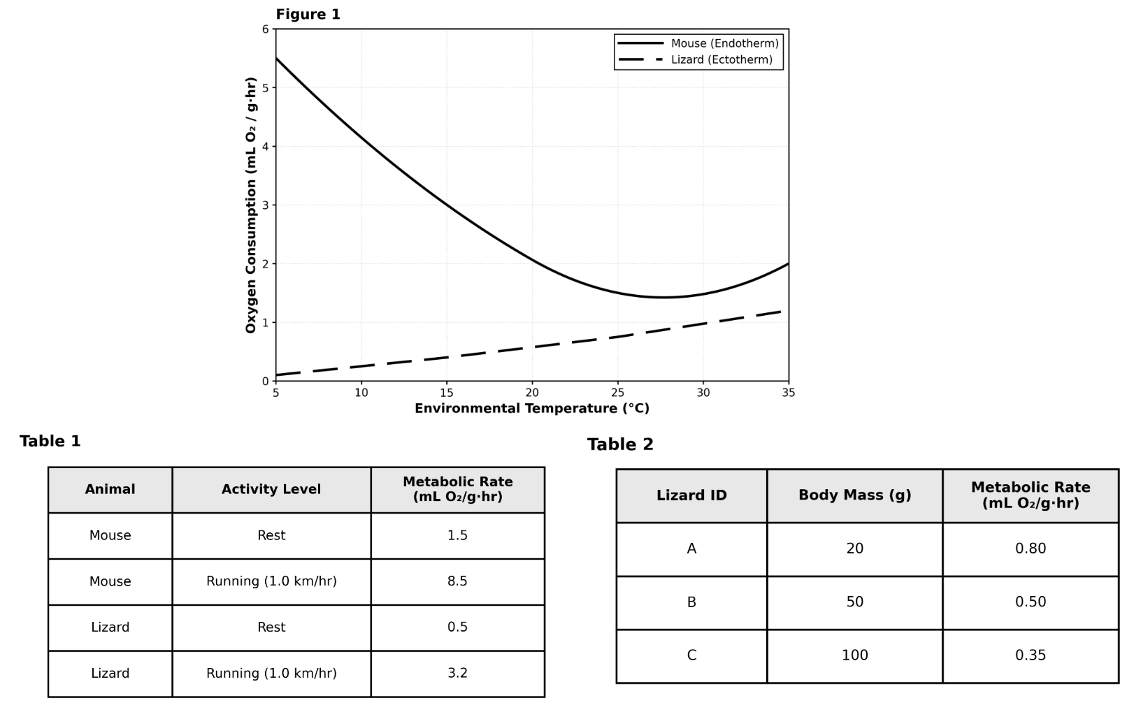 The students placed the mouse and the lizard in separate metabolic chambers. They varied the environmental temperature from 5°C to 35°C in 10°C increments. The animals were kept at rest. The rate of oxygen consumption ($mL \ O_2 / g \cdot hr$) was measured after the animals had acclimated to each temperature for 30 minutes. Findings were reported in Figure 1.