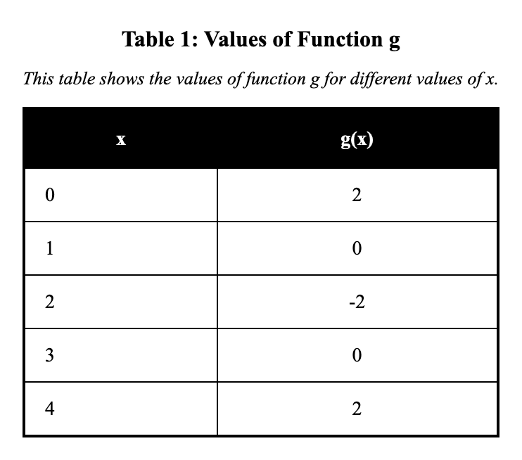 This question tests your ability to compare function properties when functions are presented in different ways—like one given as a formula and another as a table—requiring you to extract the same feature from each representation and compare them. Functions can be represented in four main ways, and each representation makes certain features easy to see: formulas let you calculate any value precisely and see structure (like $y = mx + b$ shows slope $m$ immediately), graphs show shape and extrema visually (you can spot maximums and end behavior at a glance), tables provide exact input-output pairs (easy to read specific values), and verbal descriptions summarize key features in words. To compare functions in different representations, extract the desired property from each using the method that fits that representation, then compare the extracted values! For function $f$, given as $f(x) = \left(\dfrac{1}{2}\right)^x$, calculate $f(3) = \left(\dfrac{1}{2}\right)^3 = \dfrac{1}{8}$. For function $g$, read from table $g(3) = 40$ directly. Choice B correctly extracts the output at $x=3$ from both ($\dfrac{1}{8}$ for $f$ by exponentiation, 40 for $g$ from table) and compares accurately, showing $g$ has the greater output. A common distractor like choice A might swap the values or miscalculate $\left(\dfrac{1}{2}\right)^3$ as something larger, but remember it's $\dfrac{1}{8}$, and 40 > $\dfrac{1}{8}$ is clear. Property extraction by representation type: FROM FORMULA—y-intercept: set $x = 0$; maximum of quadratic: complete square or use vertex formula; slope: read from $y = mx + b$ or calculate rise/run. FROM GRAPH—intercepts: see where crosses axes; maximum: find highest point and read coordinates; slope: pick two points, calculate rise/run. FROM TABLE—intercept: find row where $x = 0$ or $y = 0$; maximum: scan for largest y-value; slope (linear): calculate $\Delta y / \Delta x$ between any two points. Use the method matching your representation! Quick comparison shortcuts: for y-intercepts, formulas are fastest (plug in $x = 0$), but graphs let you just read off where it crosses the y-axis. For maxima, graphs are easiest (visually find highest point), but formulas of quadratics give exact vertex. For growth rates, tables let you calculate differences (linear) or ratios (exponential) directly. Play to each representation's strengths—don't convert everything to formulas if the feature is obvious in the given form! Efficient comparison means using the representation smartly.