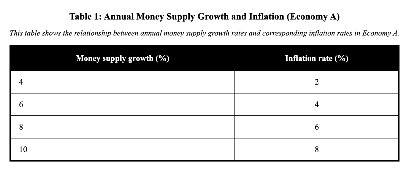 Table: Annual Money Supply Growth and Inflation (Economy A)