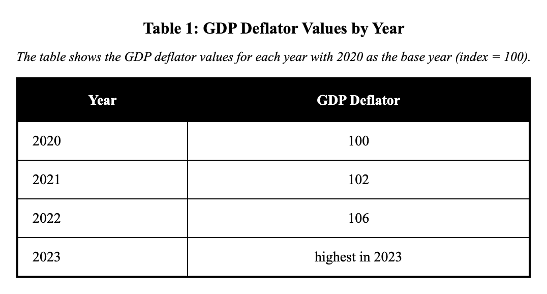 Based on the GDP deflator shown in the table (base year 2020 = 100), which period had the lowest positive inflation rate?