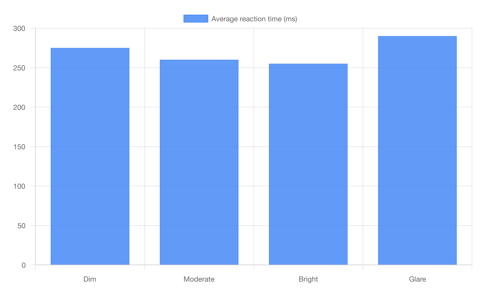A researcher compared average reaction time (milliseconds) under four lighting conditions. The researcher argues that reaction time was fastest (lowest) under Bright lighting, at _______ ms. Which choice most effectively uses data from the bar graph to complete the text?