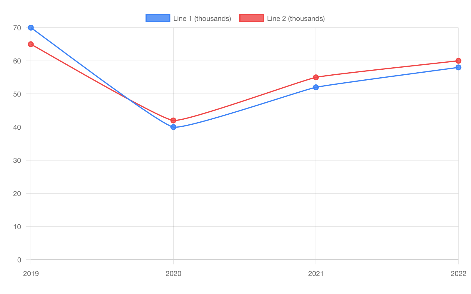 The report claims Line 2 rose more strongly from its 2020 low by a specific amount to 2022, requiring data with the largest increase from 2020 values. The line graph depicts Line 2 rising from 42 thousand in 2020 to 60 thousand in 2022, an 18-thousand increase. Choice D uses a smaller rise from 42 to 50 thousand, understating the change to 2022. Choice B shows only a 10-thousand increase from different 2020 data. For line graphs, trace the exact time period and line specified to verify trends against the claim.
