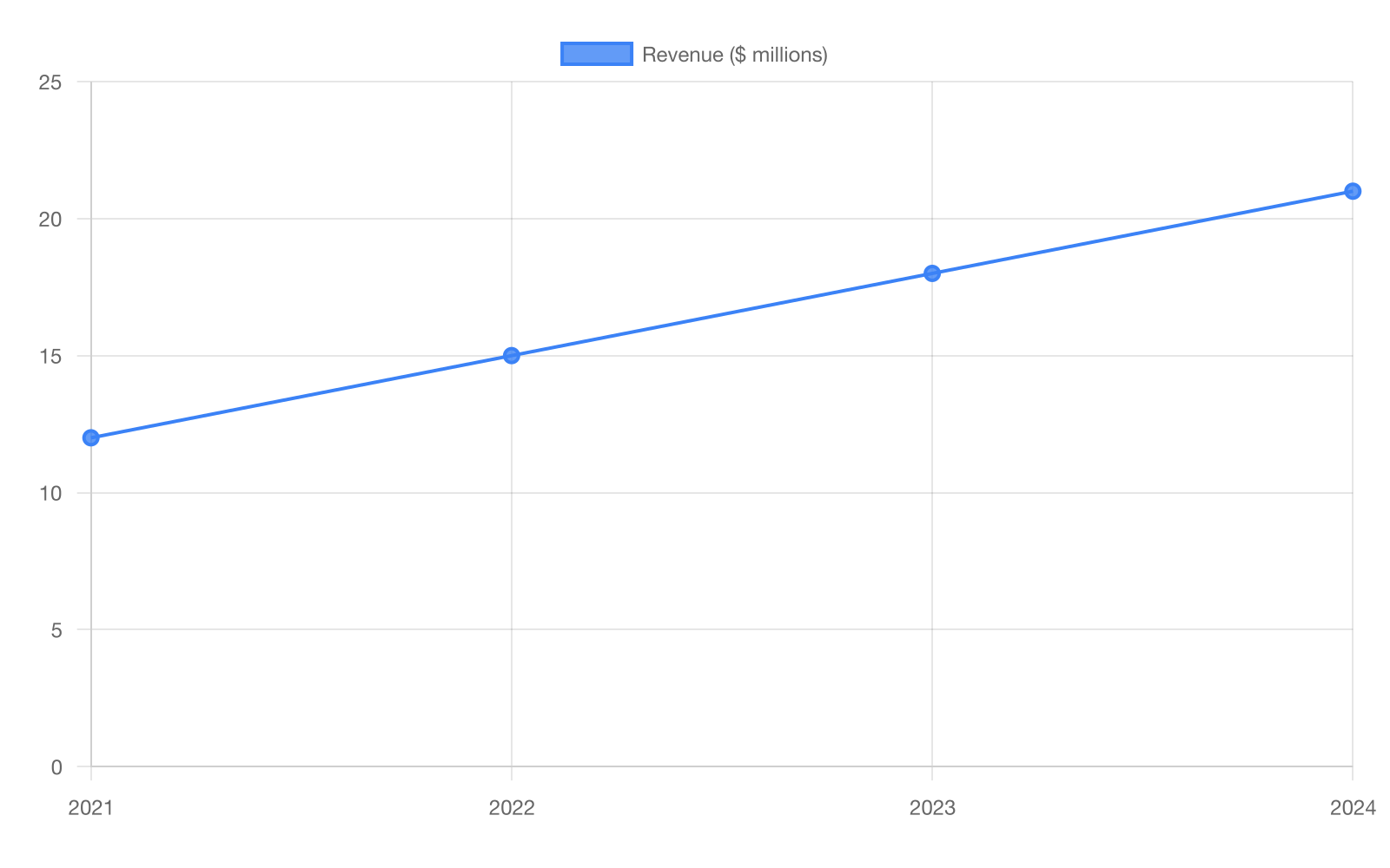 A financial report shows annual revenue (in millions of dollars) for a startup from 2021 to 2024. The report states that revenue increased each year, and that the total increase from 2021 to 2024 was _______ million dollars. Which choice most effectively uses data from the line graph to complete the text?
