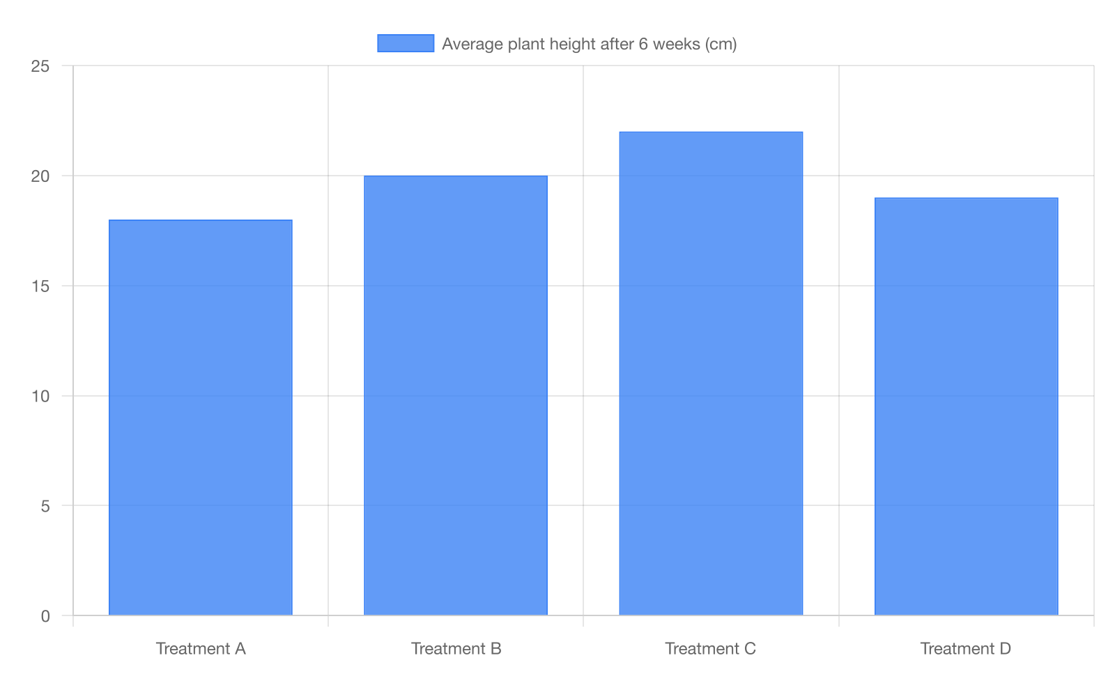 Researchers tested four soil treatments and measured plant height after 6 weeks. They argue that Treatment C produced taller plants than Treatment A by _______. Which choice most effectively uses data from the bar graph to complete the text?