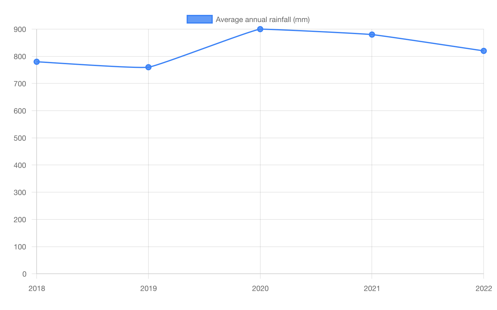 A climate summary lists average annual rainfall in a region from 2018 to 2022 (Figure 1). The summary claims rainfall was highest in 2020 and exceeded 2019 by _______ millimeters. Which choice most effectively uses data from the line graph to complete the text?