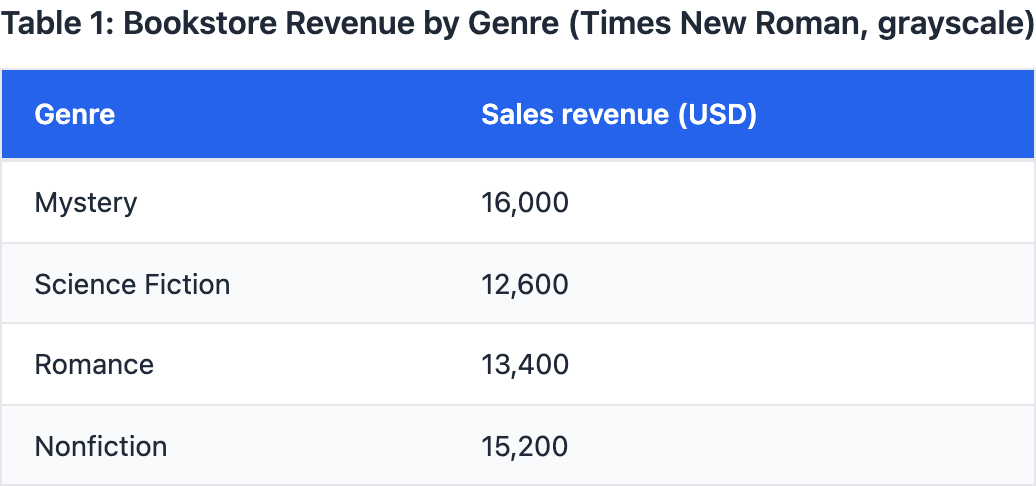 A bookstore recorded sales revenue by genre for one quarter (Table 1). A manager claims Mystery generated the most revenue, bringing in _______ more dollars than Science Fiction. Which choice most effectively uses data from the table to complete the text?