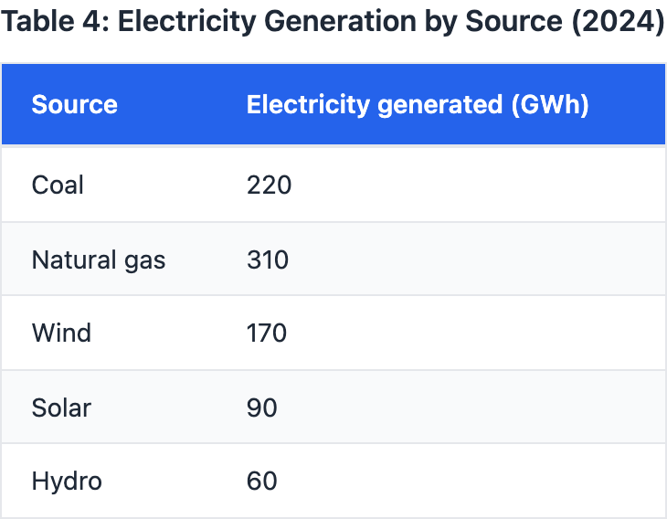 A regional energy summary lists electricity generation by source in 2024. An analyst notes that renewable sources (wind plus solar) together generated more electricity than coal by _______ gigawatt-hours (GWh). Which choice most effectively uses data from the table to complete the text?