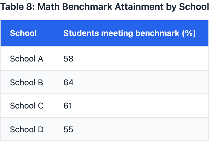 An education nonprofit tracked the percentage of students meeting a math benchmark in four schools. The nonprofit claims that School B outperformed School D by _______ percentage points. Which choice most effectively uses data from the table to complete the text?