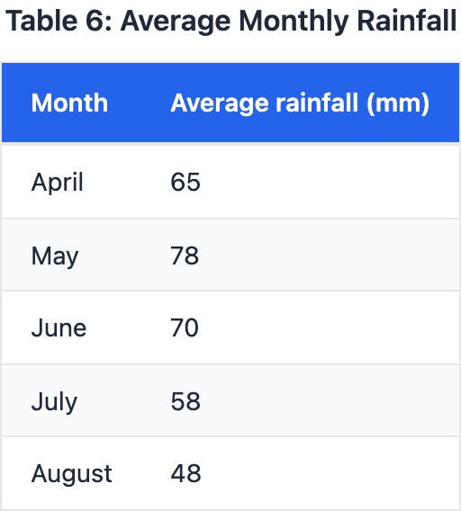 The summary notes rainfall decreased monthly from May to August, dropping from 78 mm in May to a specific amount in August, so data should show the August value fitting the decline pattern. The table lists August at 48 mm, consistent with decreases from 78 mm. Choices like D at 60 mm would not show a decrease if misreading months. In sequential data tables, confirm the direction of change across all periods mentioned.