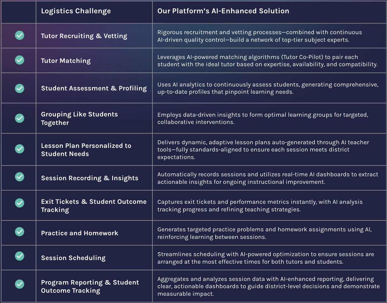 Rigorous vetting process ensures high quality tutors at scale.